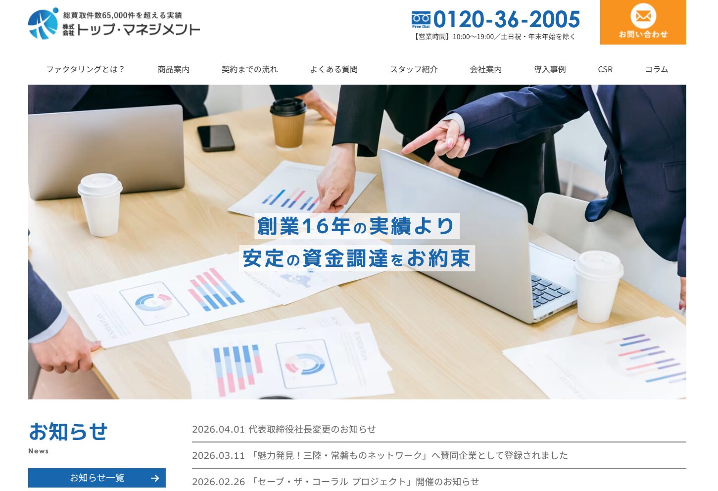 株式会社トップマネジメントは、他社からの乗り換えや他社利用中の方の申し込みにも積極的に対応しているファクタリング会社です。2社間・3社間ファクタリングをはじめ、助成金サポートと手数料優遇を組み合わせた「ゼロファク」、手数料を抑えられる2.5社間の「電ふぁく」など、独自サービスが充実しています。