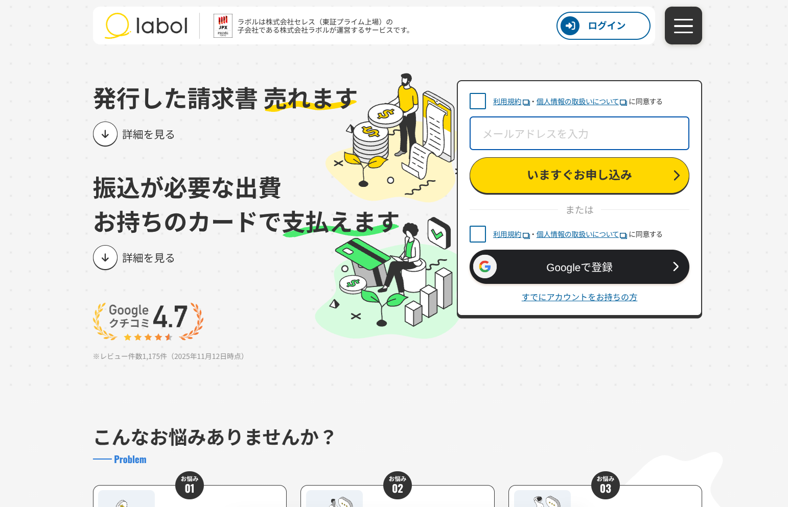 ラボルは、東証プライム上場企業・株式会社セレスの子会社が運営するフリーランス・個人事業主向けのファクタリングサービスです。1万円という業界最低水準の少額から利用でき、手数料は一律10%と分かりやすい料金体系を採用しています。最短30分でのスピード入金にも対応しており、請求書の一部のみを買い取る部分買取にも対応しています。