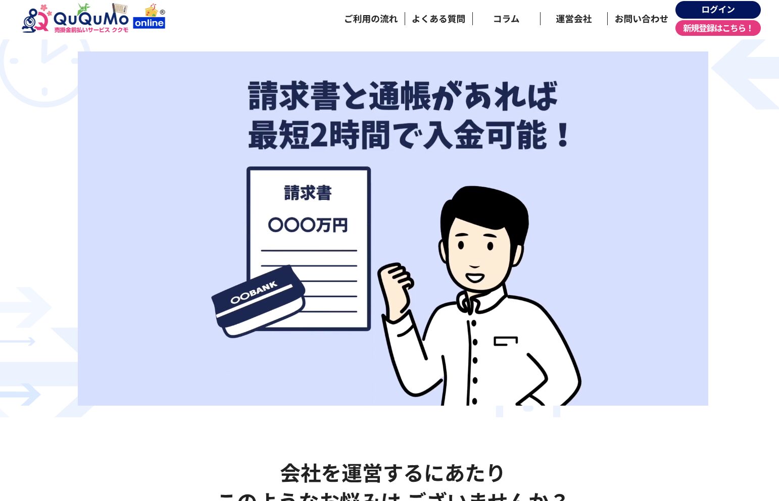 QuQuMoは、必要書類が請求書と通帳の2点のみで最短2時間での入金が可能なオンライン特化型のファクタリングサービスです。手数料は1%からと業界でも最低水準に近く、法人・個人事業主を問わず利用できます。