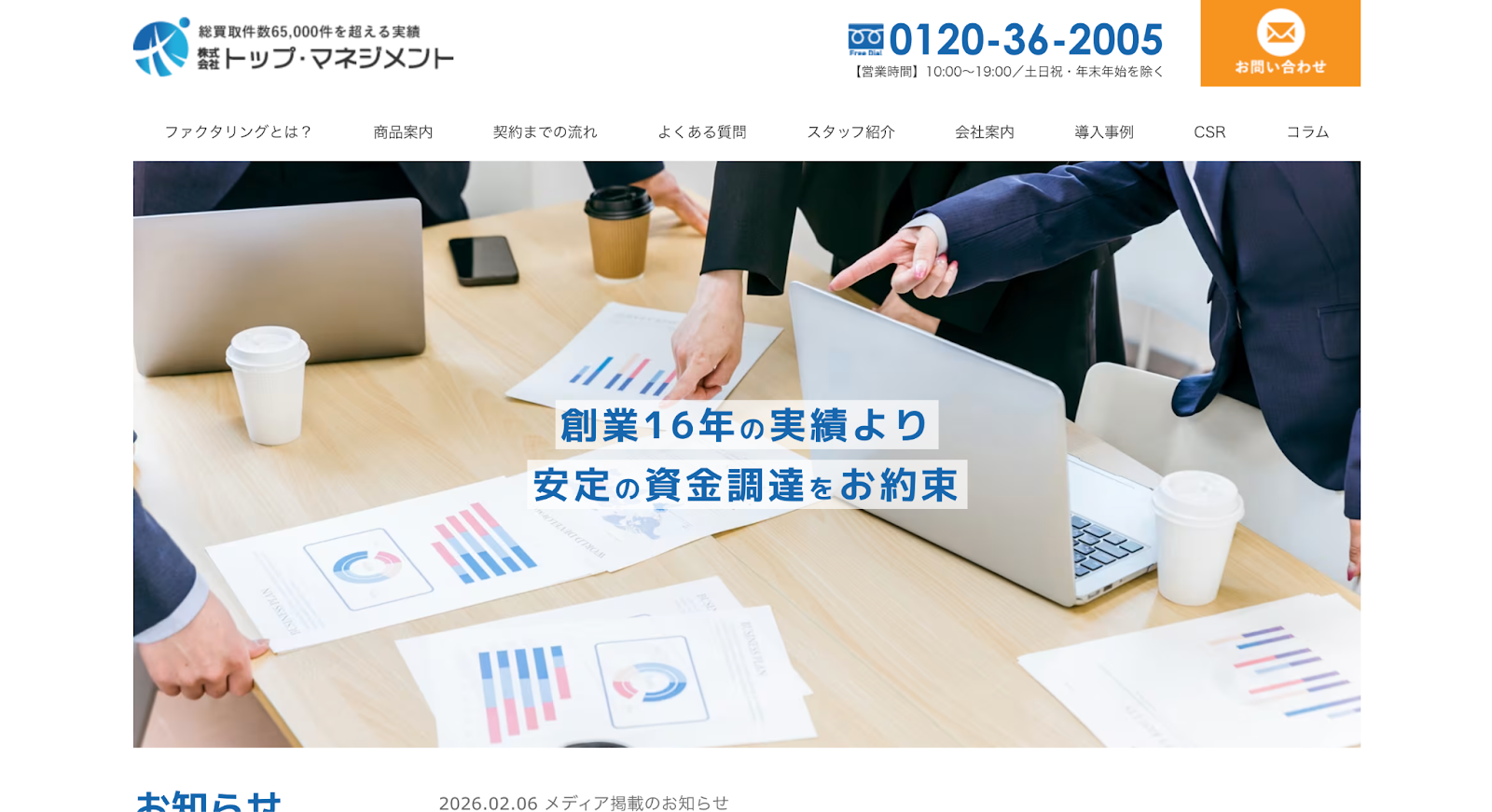 資金調達をお考えの事業者様には、株式会社トップ・マネジメントのファクタリングサービスをお勧めします。創業16年の豊富な実績と確かなノウハウで、中小企業や個人事業主の資金繰りをサポートしてきた実績があります。業界最安水準の手数料設定と高い成約率に加え、豊富な商品ラインナップの中からお客様の状況に最適なプランをご提案いたします。