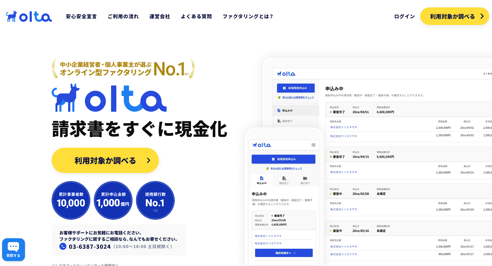 見積書や受注書の段階でも資金調達できる仕組みや、利用者の手数料負担を抑えた新サービス「電ふぁく」など、独自のサービスも展開しており、早期の資金化ニーズに応えてくれます。中小企業や個人事業主の資金繰り改善に積極的に取り組んでおり、審査においても柔軟な姿勢を示しています。