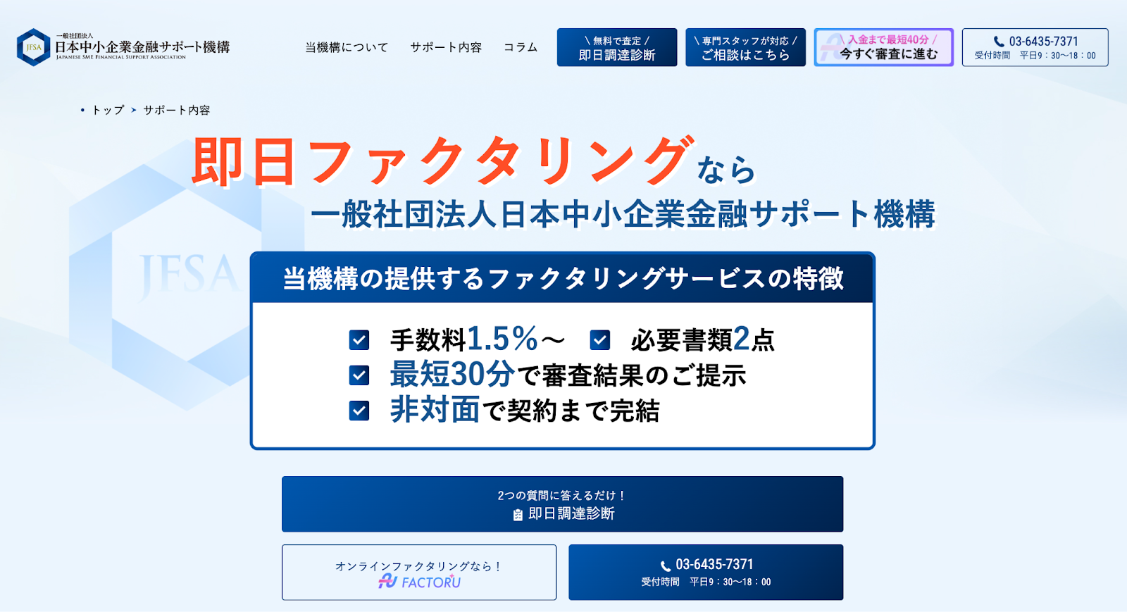 一般社団法人日本中小企業金融サポート機構のファクタリングは、非営利団体ならではの手数料1.5%〜という業界最低水準が最大の魅力です。コストを徹底削減し、利用者に還元する姿勢で中小企業や個人事業主の資金繰りを支えています。