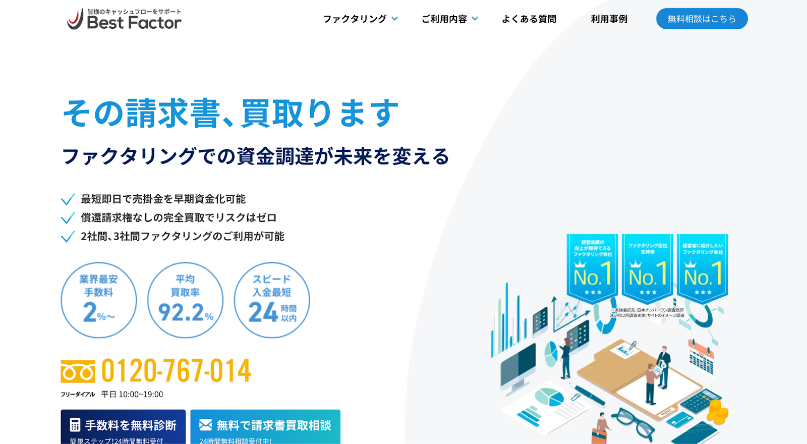 ベストファクターは、中小企業の資金調達を「2社間ファクタリング」でサポートし、取引先や金融機関に知られずに資金化できる点が大きな特徴です。 手数料は業界最高水準の2%〜とされており、3社間ファクタリングの価格を踏まえて不自然に2社間の手数料を引き上げない、良心的な設定を掲げています。 必要書類を事前に揃えることで、最短1日で売掛金の早期資金化が可能なスピード感も強みです。