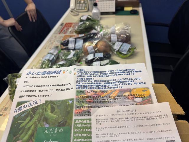 さいたま市のふじた農場から届いた採れたての新鮮野菜は、茄子やじゃがいも、枝豆やきゅうりなど11種類も入っており、社員の皆も喜んで持ち帰ってくれました。