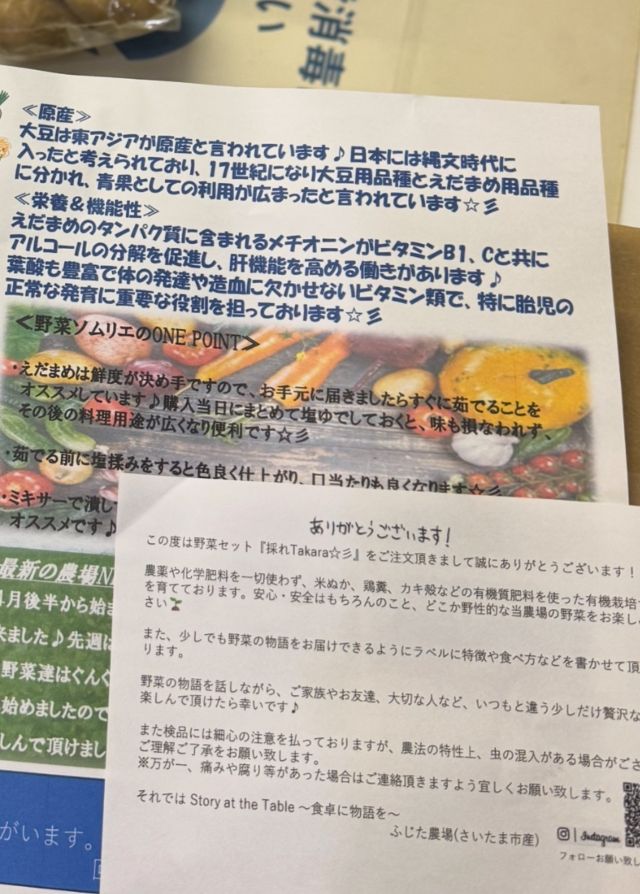 今回で3回目の購入となる、さいたま市で農業を営む「ふじた農場」より、ふわとろ長なすや白いゴーヤ、ピーマン、赤玉ねぎ、ズッキーニ、ジャガイモ、つるむらさきなど沢山の新鮮な野菜が届きました。