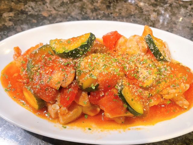 ふじた農場より届いた立派なズッキーニを使ったトマトと鶏肉とズッキーニの煮込み。