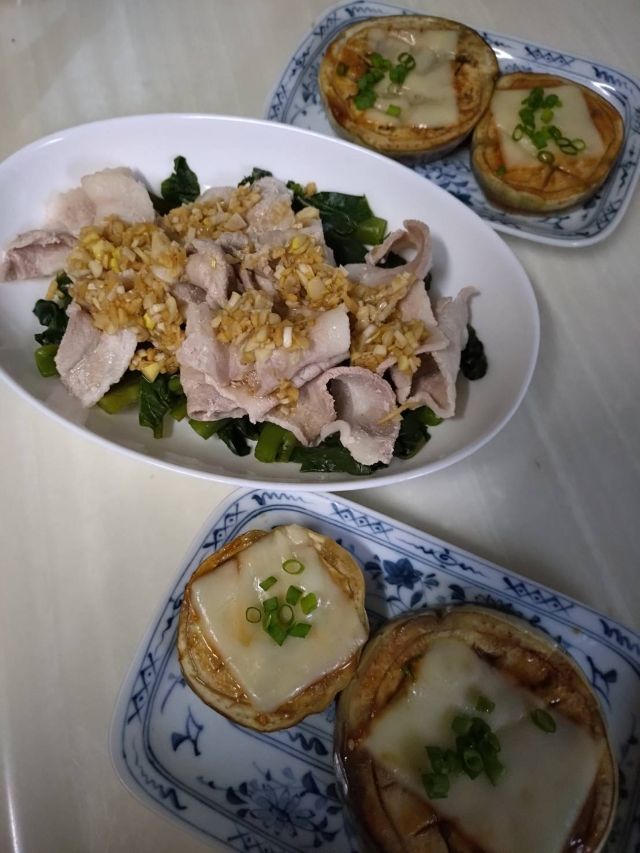 ふじた農場より届いた新鮮な茄子のチーズ焼きやほうれん草を使った豚肉料理。美味しそうです。