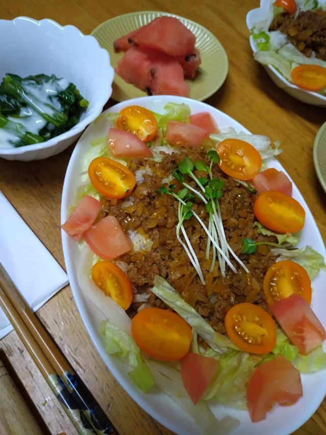 ふじた農場より届いた新鮮なミニトマトを使ったタコライスと、青野菜のお浸し。