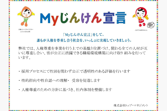 株式会社トップ・マネジメントは、法務省が推奨している「MYじんけん宣言」に賛同しています。