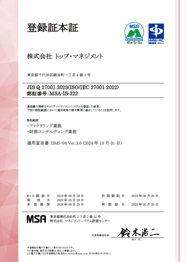 弊社は、このコミュニティへの参加を通じ、自社における情報セキュリティ基盤をより強固にすることで、ファクタリング事業及び経営コンサルティング事業における顧客情報の保護を徹底し、ユーザーからの信頼をより一層高めてまいります。