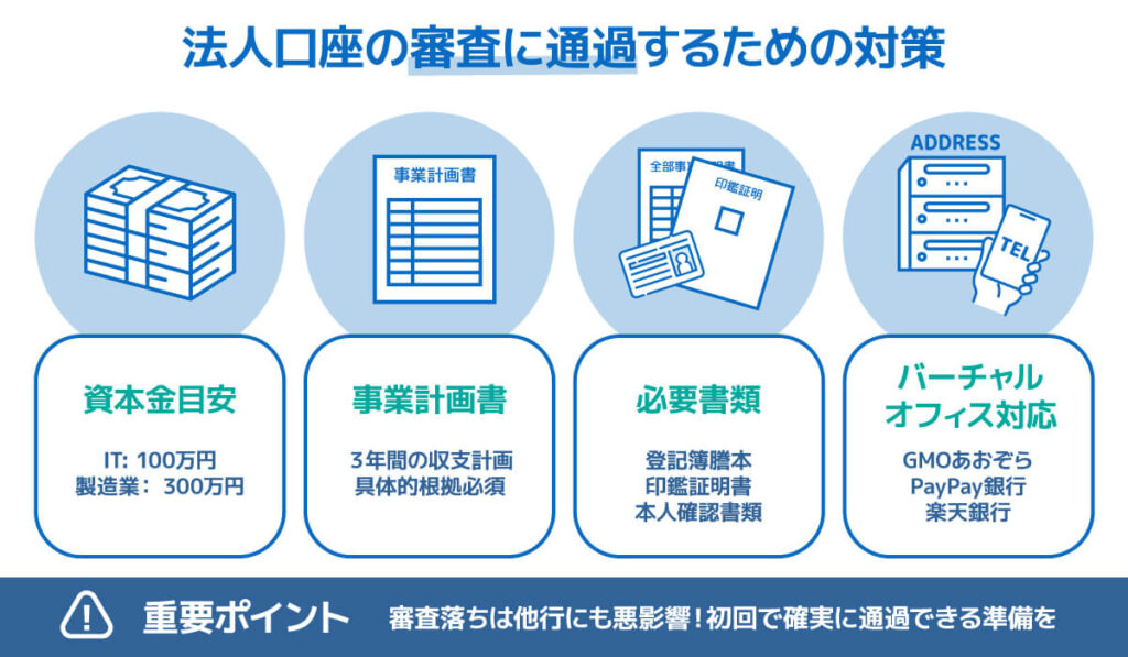法人口座開設時の審査では、金融機関が企業の事業実態、代表者の信用力、資金の健全性を総合的に評価します。近年、マネーロンダリング対策の強化により審査基準は厳格化しており、事前の準備が成功の鍵となります。