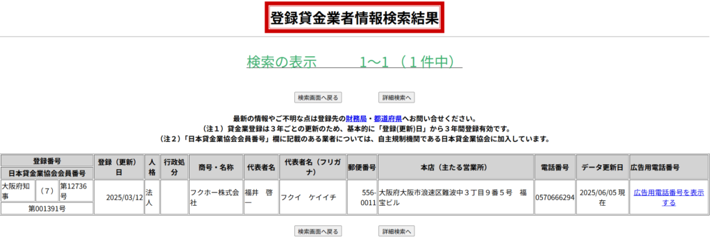 ちなみに「金融庁」の「登録貸金業者情報検索サービス」からも、フクホーは正式に登録を受けている貸金業者であることが分かります。