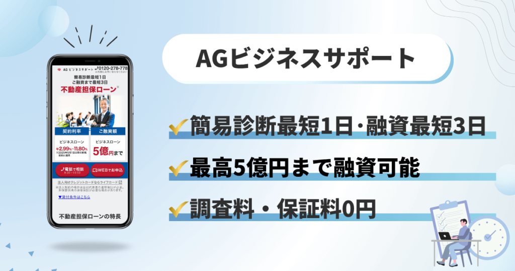 第1位【AGビジネスサポート】簡易診断最短1日、融資まで最短3日