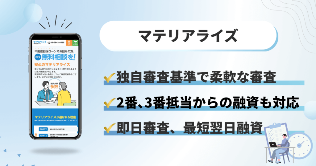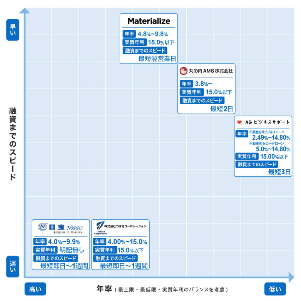 | マテリアライズ | 不動産担保ローン | 4.8%~9.8% | 15.0%以下 | 100万円~3億円 | 最短翌営業日(最短即日審査) | 1ヵ月~20年 | 法人・個人事業主・個人 | 東京都知事(3)第31620号 | 第005966号 |
