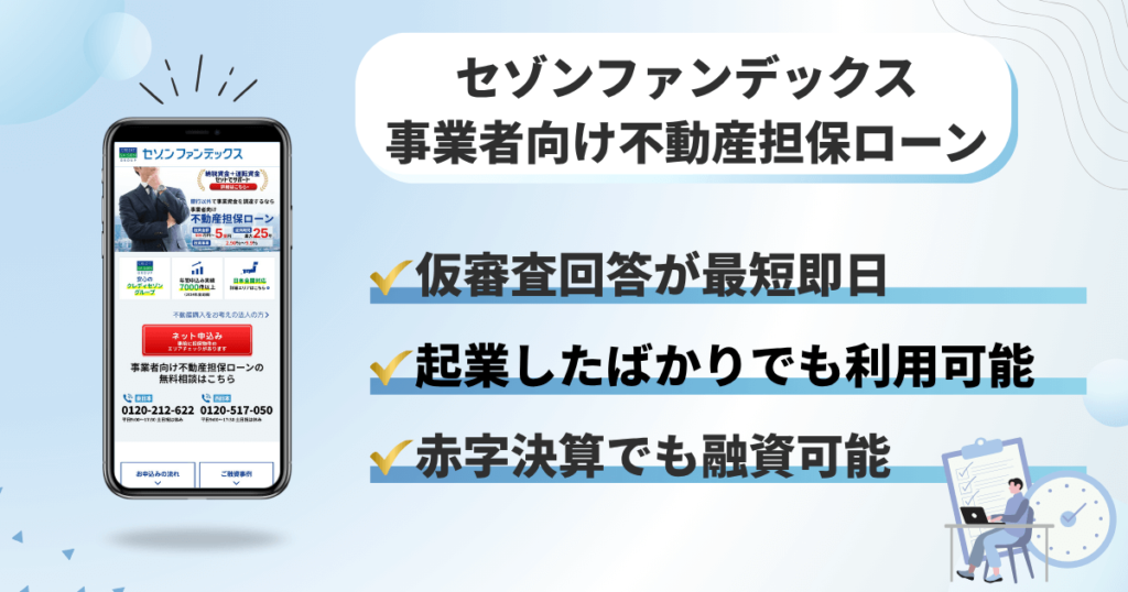 「年会費永久無料」が人気の「セゾンカード」を発行する「株式会社クレディセゾン」。その関連会社である「株式会社セゾンファンデックス」が手掛ける事業資金対応の不動産担保ローンです。仮審査回答は最短即日、必要書類の提出から最短3営業日で本審査が実施されます。