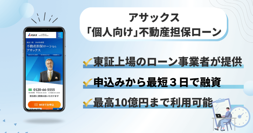 | アサックス | 個人向け不動産担保ローン | 1.95%~7.80% | 15.0%以下 | 300万円~10億円 | 最短3日 | 3ヶ月~35年 | 個人 | 関東財務局長(14)第00035号 | 第000023号 |