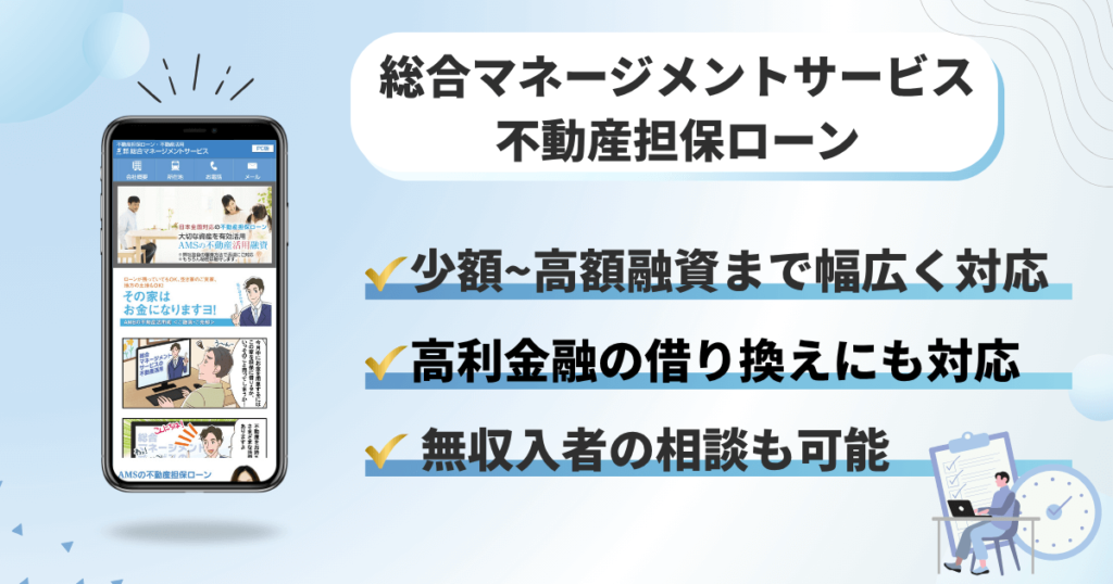 その名の通り、東京都丸の内に事務所を構える「丸の内AMS株式会社」が提供する不動産担保ローンです。対応エリアは東京都、神奈川県、埼玉県、千葉県となっており(一部対応外)、かなり限定されていますが、法人・個人事業主向けの事業資金や個人向けの消費性資金に、最高5億円まで対応できます。「AMS」の由来は「アセット・マネジメント・サービス」からきています。お客様の大切な資産(アセット)を、最大限有効に活用(マネジメント)し、希望額を希望日に提供(サービス)する営業方針の元で顧客勧誘を行っています。