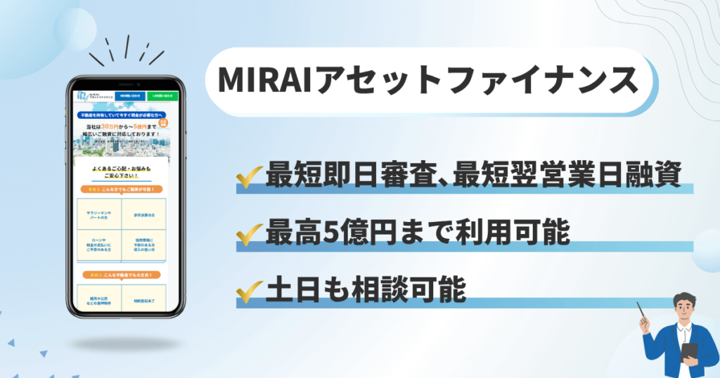 | MIRAIアセットファイナンス | 不動産担保ローン | 4.0%~9.5% | 15.0%以下 | 30万円~5億円 | 最短翌営業日 | 最長20年 | 法人・個人事業主・個人 | 東京都知事(1)第31990号 | 第006358号 |