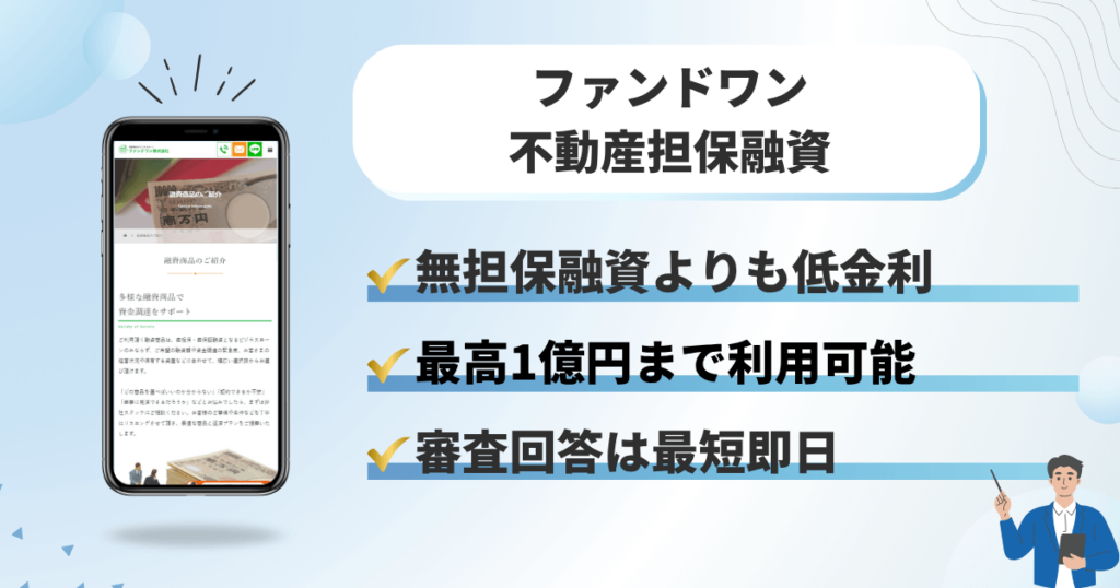 | ファンドワン | 不動産担保融資 | 2.50%~15.0% | 15.0%以下 | 300万円~1億円 | 数日~1週間程度 | 最長420ヶ月 | 法人・個人事業主 | 東京都知事(2)第31816号 | 第006140号 |